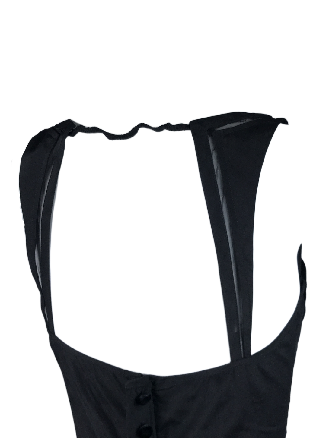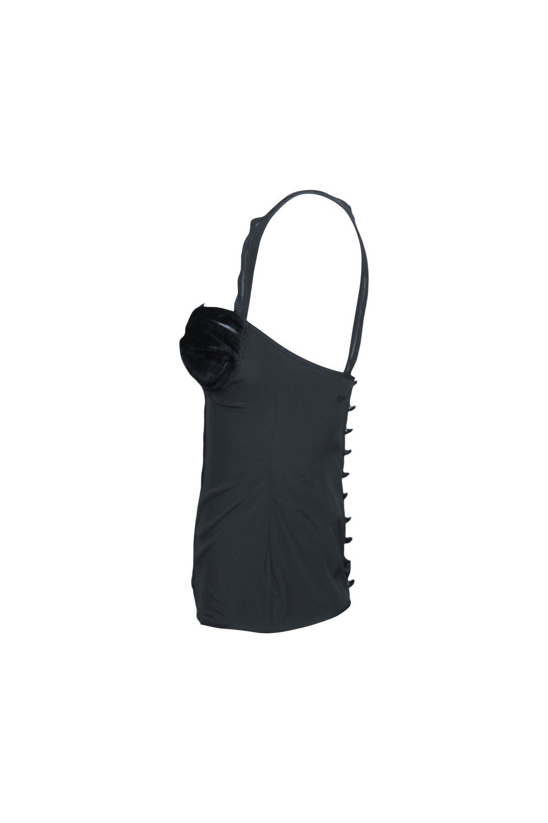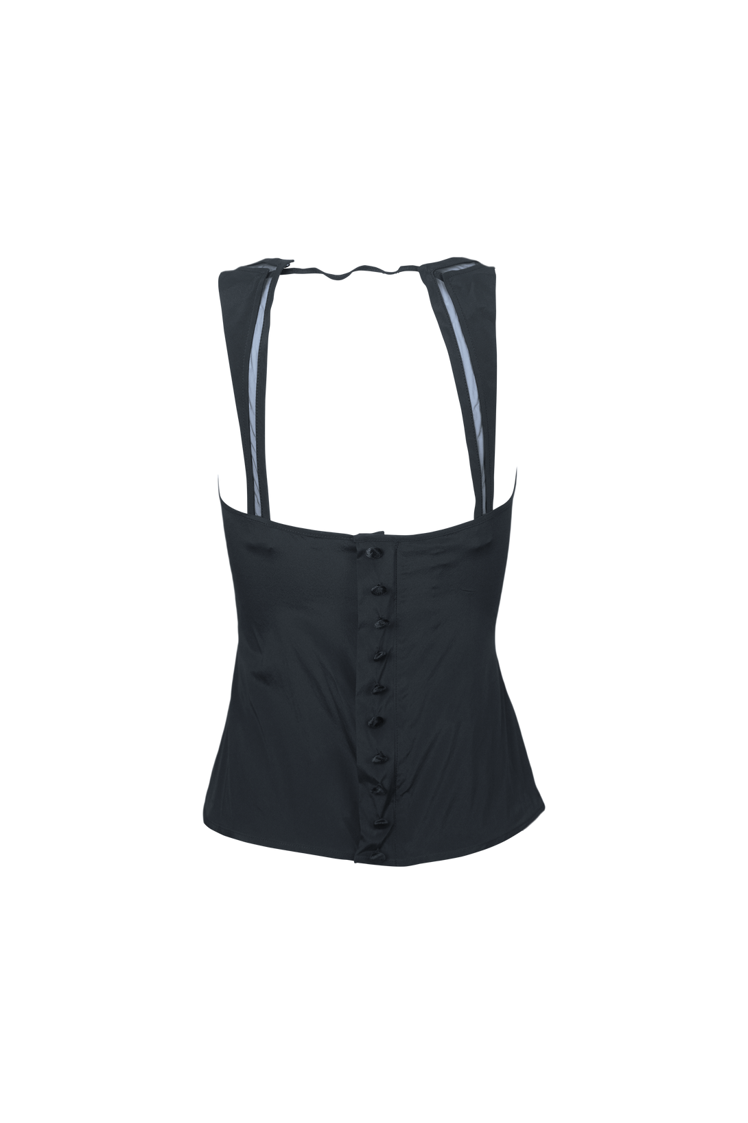 This is a bold and sultry black corset-style top that exudes modern sophistication and edge. The top features a structured design with a sweetheart neckline, accentuated by velvet cups that add texture and a luxurious feel. Thin straps and a fitted bodice highlight the silhouette, while the vertical piping detail elongates the torso and enhances the sleek, form-fitting look.