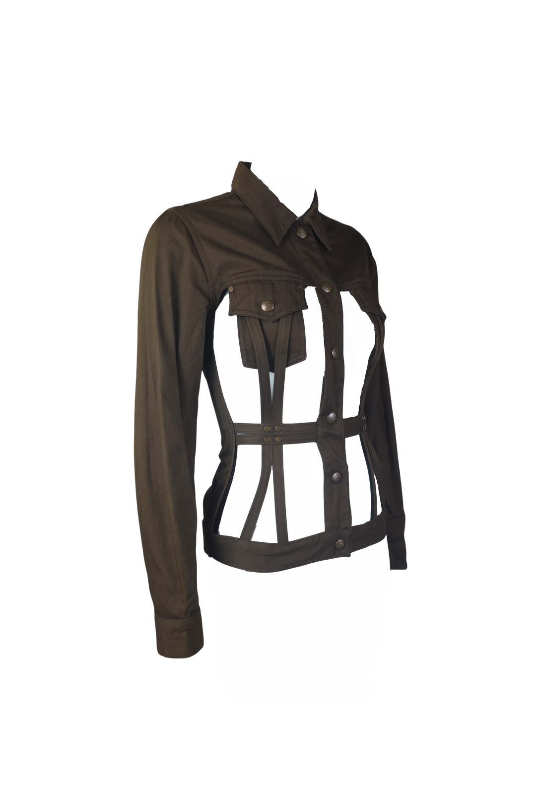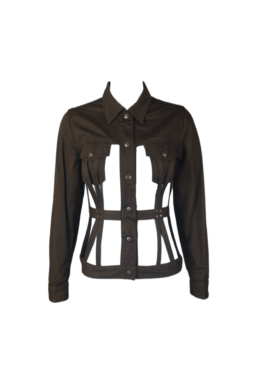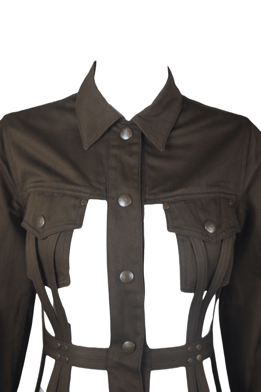 This unique jacket from Jean paul gaultier's late 1980s collection features a bold cutout design that creates a structured, cage-like effect. Made from durable fabric in a deep brown tone, it includes classic details such as a pointed collar, button-down front, and chest flap pockets with button closures. The open panels add a daring, modern twist to the traditional jacket silhouette, offering a statement piece that blends edgy style with utilitarian elements. Perfect for layering over bold outfits or creating a standout look.