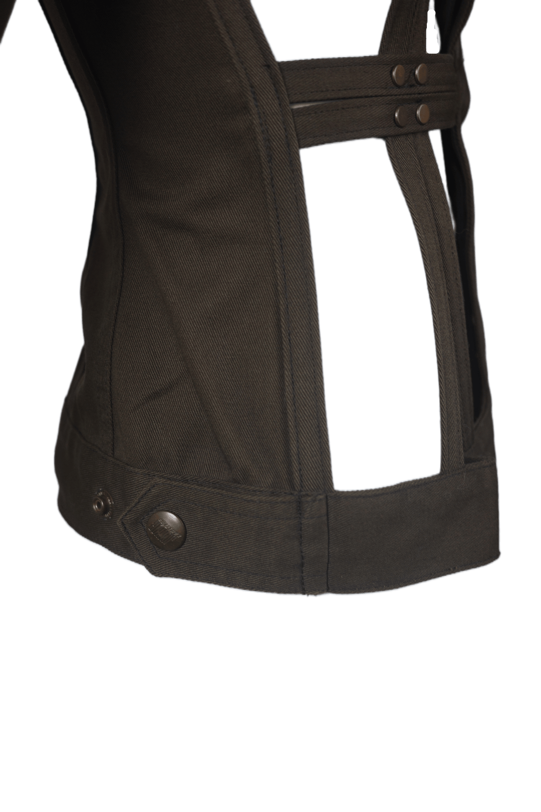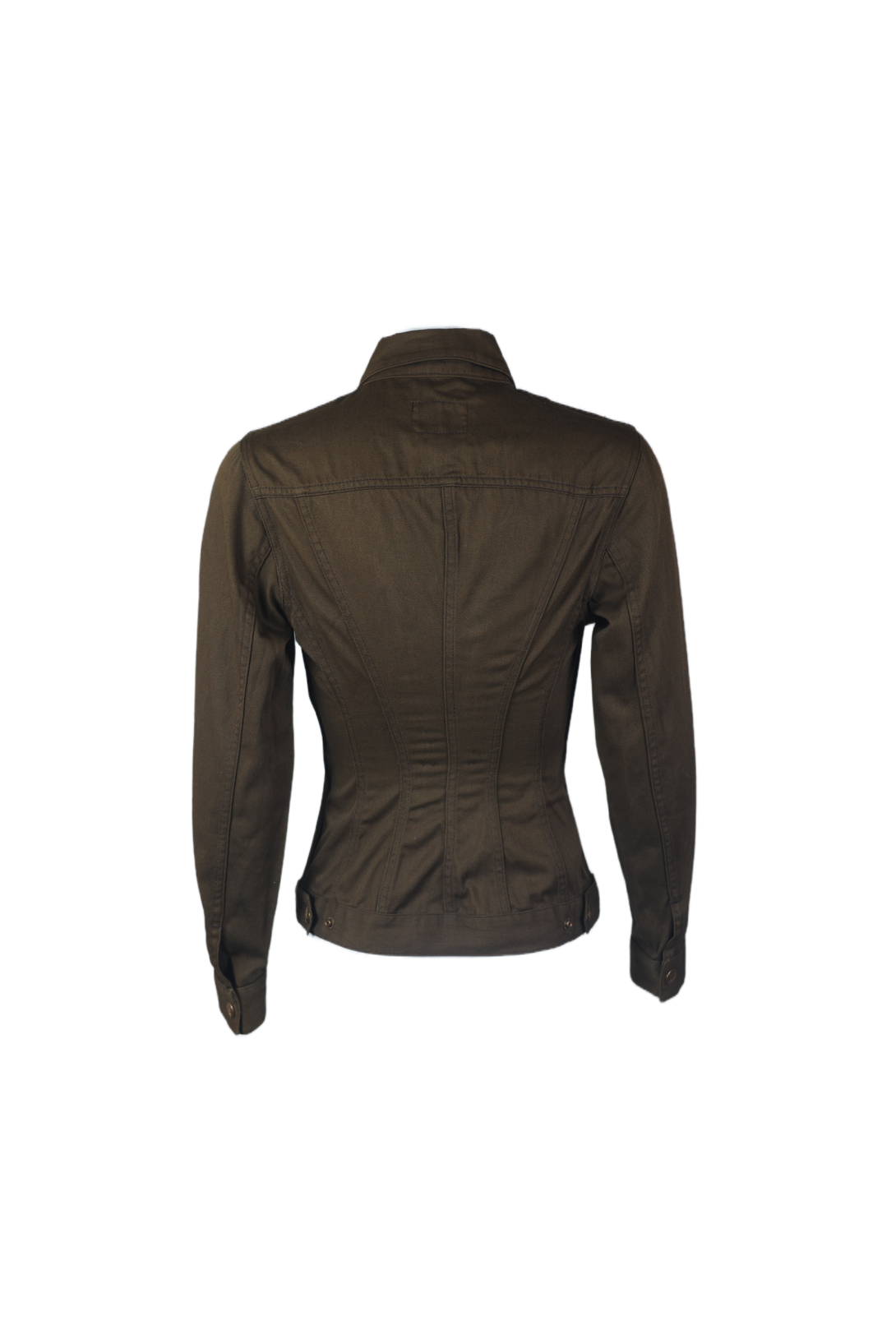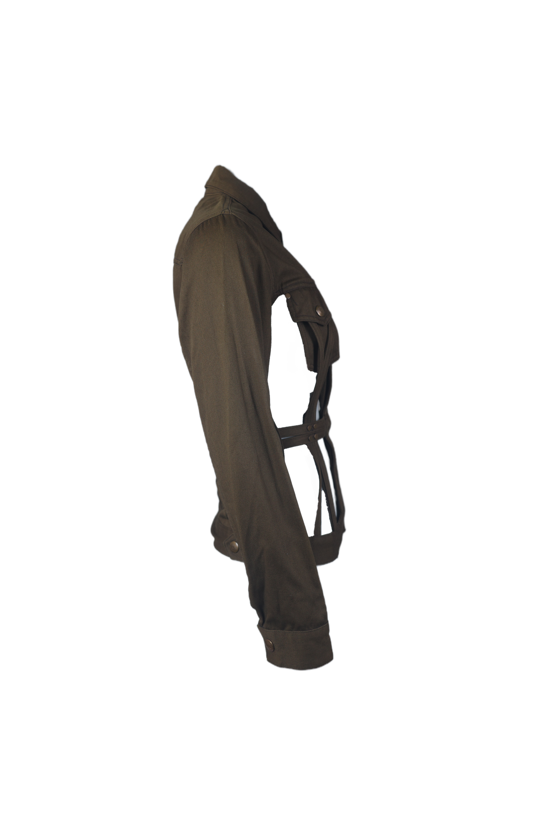 This unique jacket from Jean paul gaultier's late 1980s collection features a bold cutout design that creates a structured, cage-like effect. Made from durable fabric in a deep brown tone, it includes classic details such as a pointed collar, button-down front, and chest flap pockets with button closures. The open panels add a daring, modern twist to the traditional jacket silhouette, offering a statement piece that blends edgy style with utilitarian elements. Perfect for layering over bold outfits or creating a standout look.