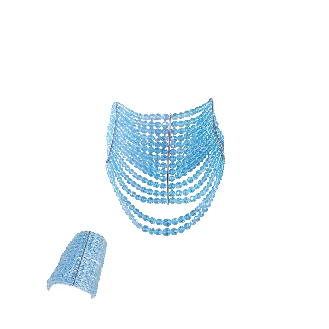 A luxurious set featuring a beautifully crafted baby blue beaded choker and matching bracelet, designed by Dior. The intricate beadwork creates a stunning visual effect, with layers that form a bold and elegant silhouette. Perfect for adding a pop of color to any outfit, this set embodies Dior's commitment to high-quality craftsmanship and timeless elegance. Ideal for formal occasions or as a statement piece for any ensemble.